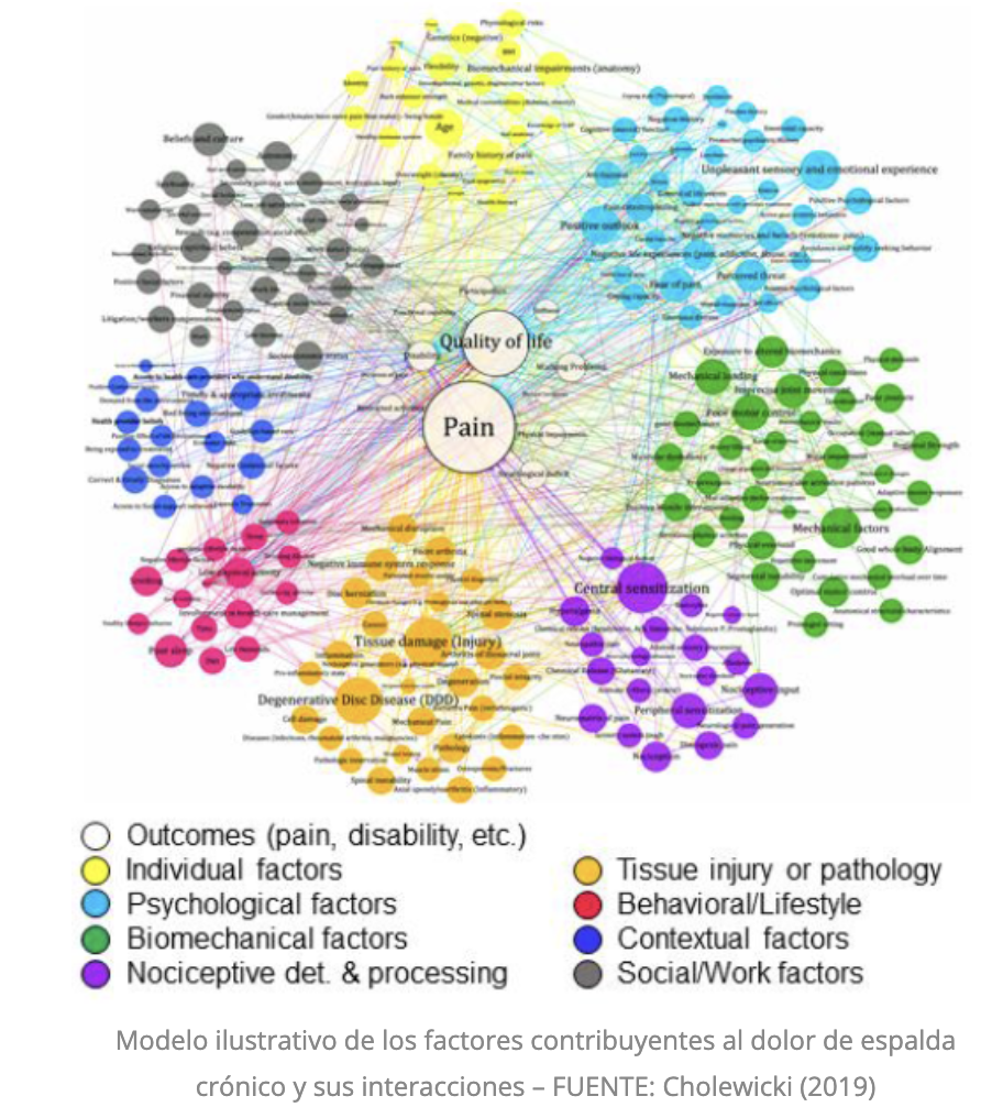 El estudio de Jacek Cholewicki (2019) ofrece una representación clara de esta complejidad: una red donde el dolor ocupa el centro de factores individuales, psicológicos, biomecánicos y sociales.