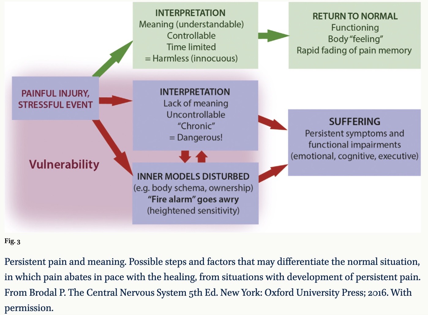 La imagen refuerza una idea central: no es únicamente la lesión la que determina la evolución, sino la interpretación del dolor, modulada por la vulnerabilidad individual y el contexto, la que define si el sistema vuelve a la normalidad o si el dolor se cronifica.